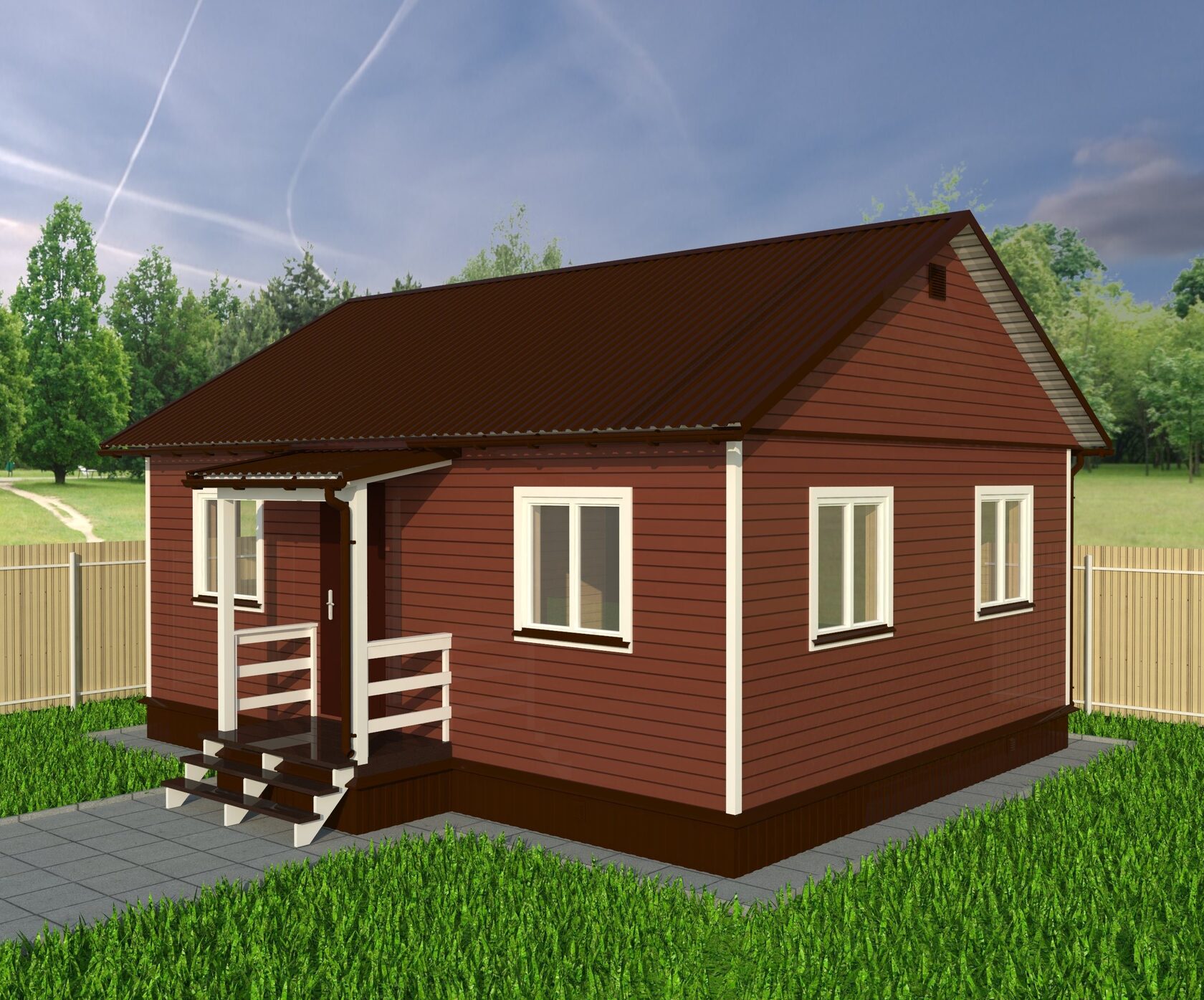 Кровля: Стропила − п/м 40х150 мм. Кровля − профнастил оцинкованный, укладывается и закрепляется на обрешетке из п/м 20х100 мм., по гидроизоляционной ветрозащитной паропроницаемой мембране.