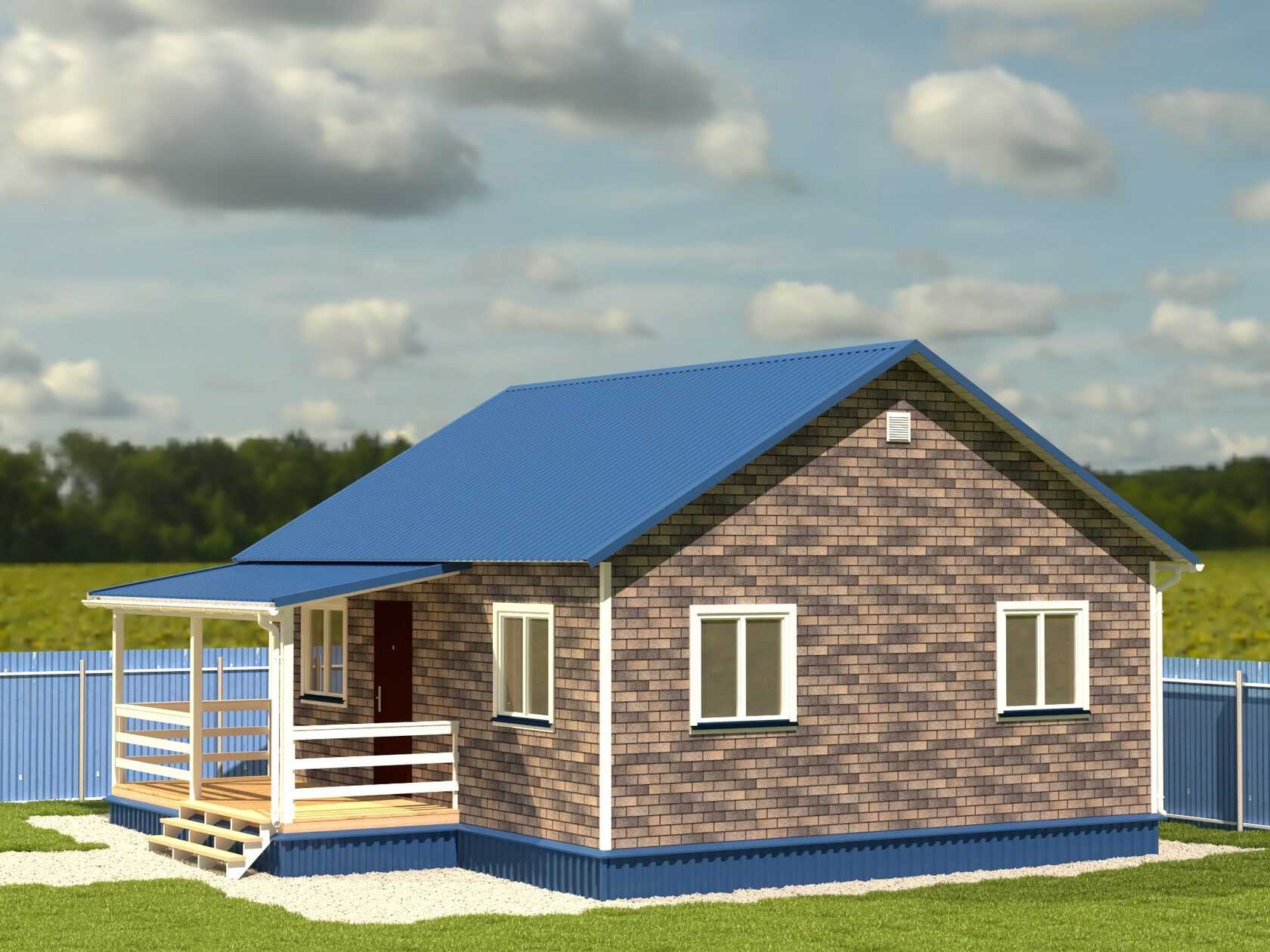Фундамент: Свайный 108х2500 мм.. Цоколь обшит оцинкованным профнастилом .